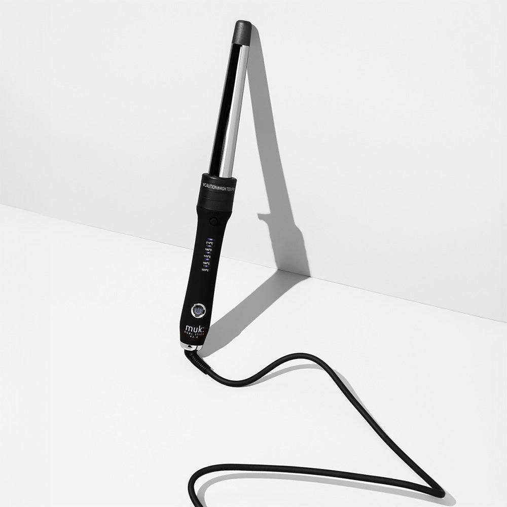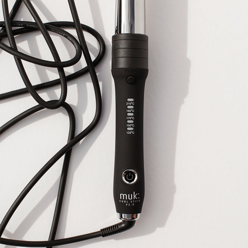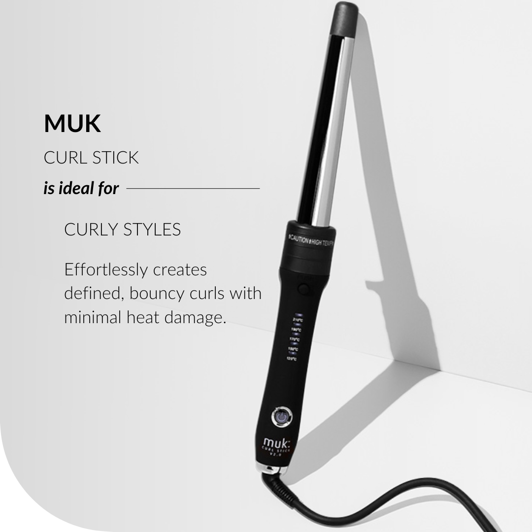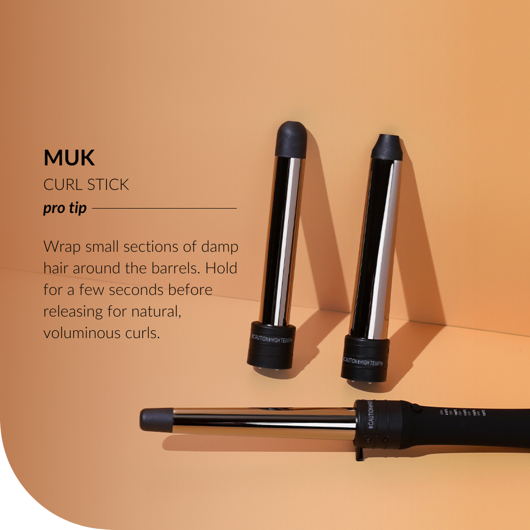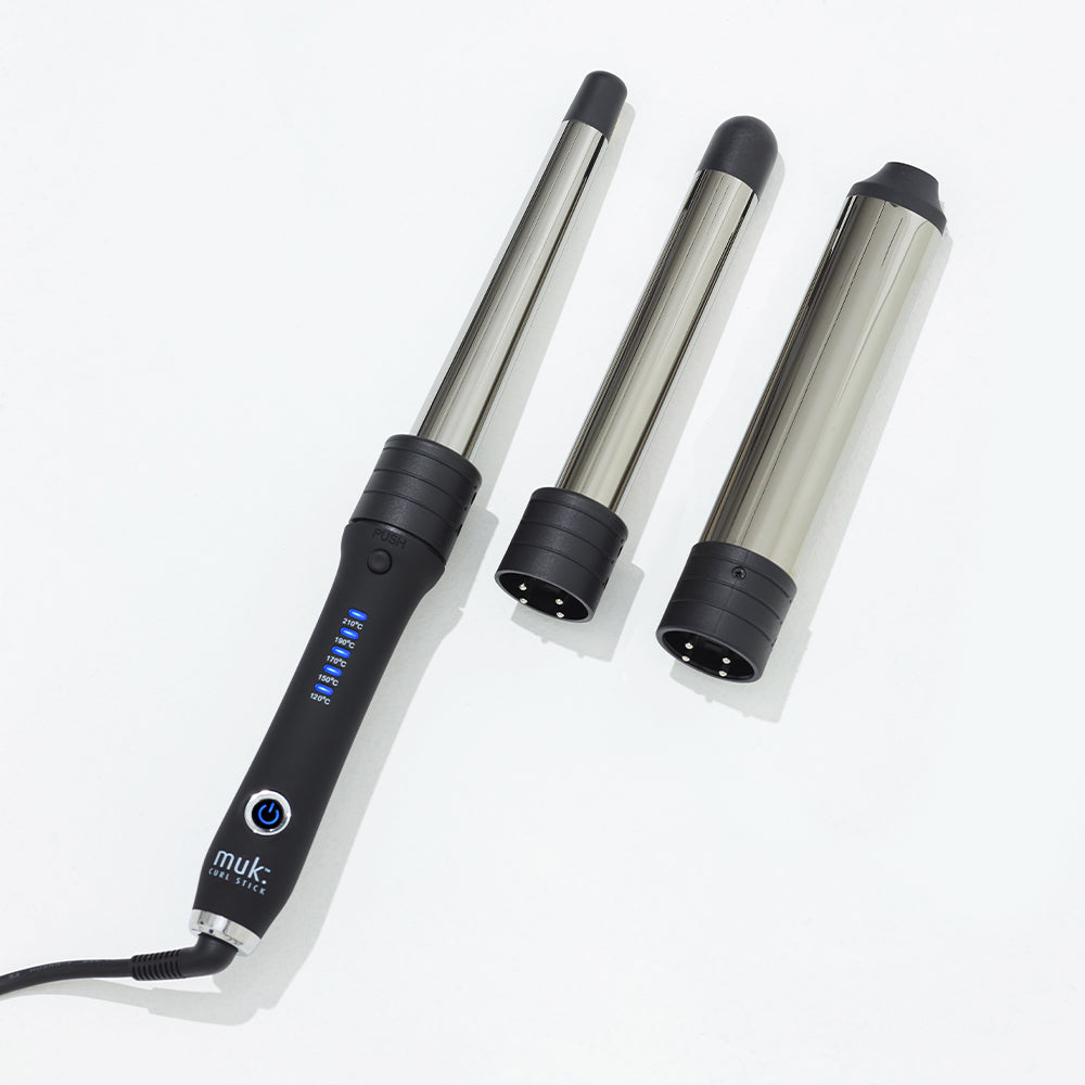 The ultimate styling tool for all hair types, the muk Curl Stick is designed to create long lasting curls, any shape or style you desire. With 3 interchangeable barrels in various sizes, the curling options are limitless. Each barrel is finished in smooth titanium providing instant results of static free curls and shine.