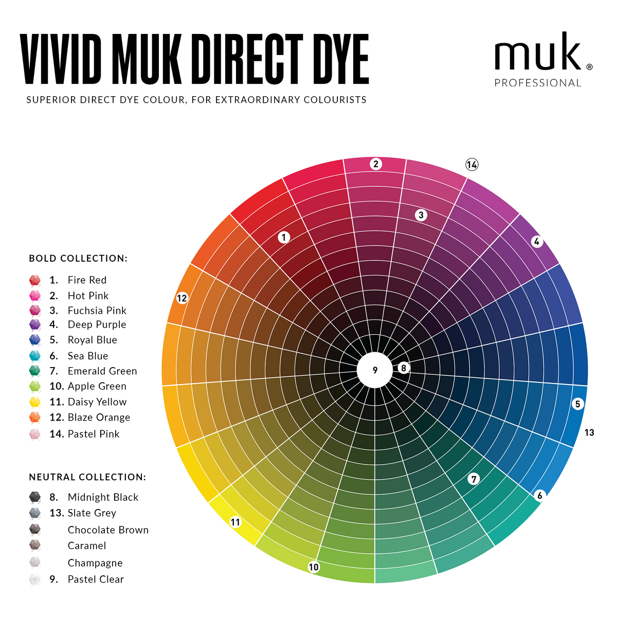 Vivid muk Direct Dye offers colourists unlimited creativity and the freedom to customise and complement colour techniques that use the muk Hybrid Cream Hair Colour range. The integrated colour palette of Vivid muk Direct Dye offers colourists not just the possibility of creating intense vibrant results, but also limitless commercial colour possibilities.
