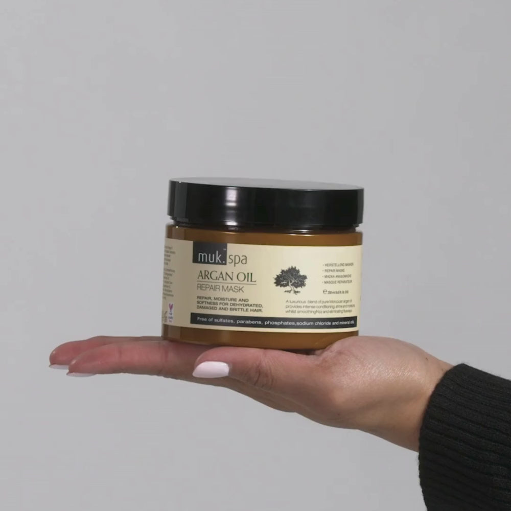 Containing a luxurious blend of pure Moroccan Argan Oil, Sweet Almond Oil, Linseed Oil, Aloe Vera Extract and Hydrolysed Keratin, muk Spa Argan Oil Repair Mask repairs and rejuvenates dehydrated, damaged and brittle hair. Colour and Keratin Treatment safe.